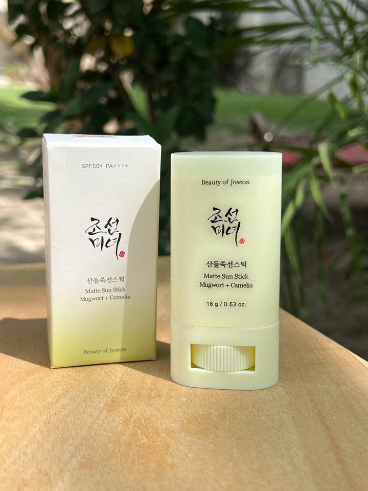 Beauty of Joseon Matte Sun Stick Mugwort + Camelia SPF50+ is a compact, mess‑free sunscreen stick that delivers broad‑spectrum SPF 50+ protection with a matte finish, soothing mugwort, and hydrating camellia extract.