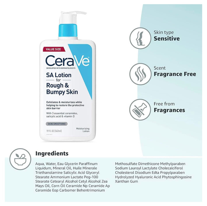 CeraVe SA Smoothing Lotion gently exfoliates and hydrates dry, rough, and bumpy skin. Infused with salicylic acid, ceramides, and hyaluronic acid, it restores your skin’s natural softness without irritation.