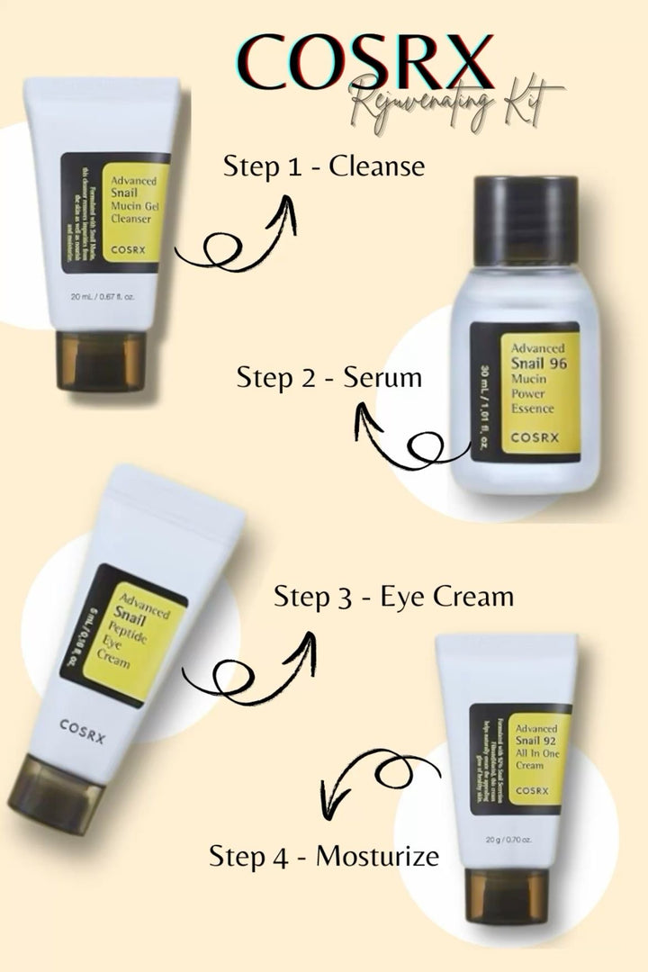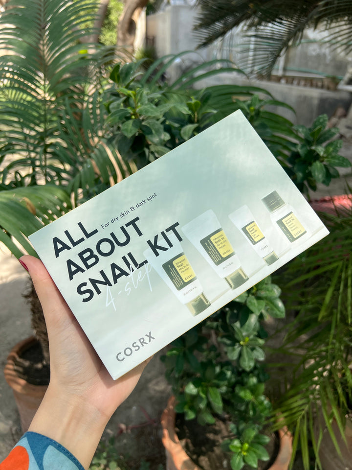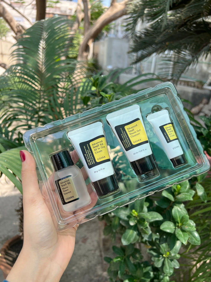 COSRX All About Snail Mini Set is a travel‑sized skincare kit featuring snail mucin–infused cleanser, essence, eye cream, and moisturizer designed to repair, hydrate, and soothe tired skin
