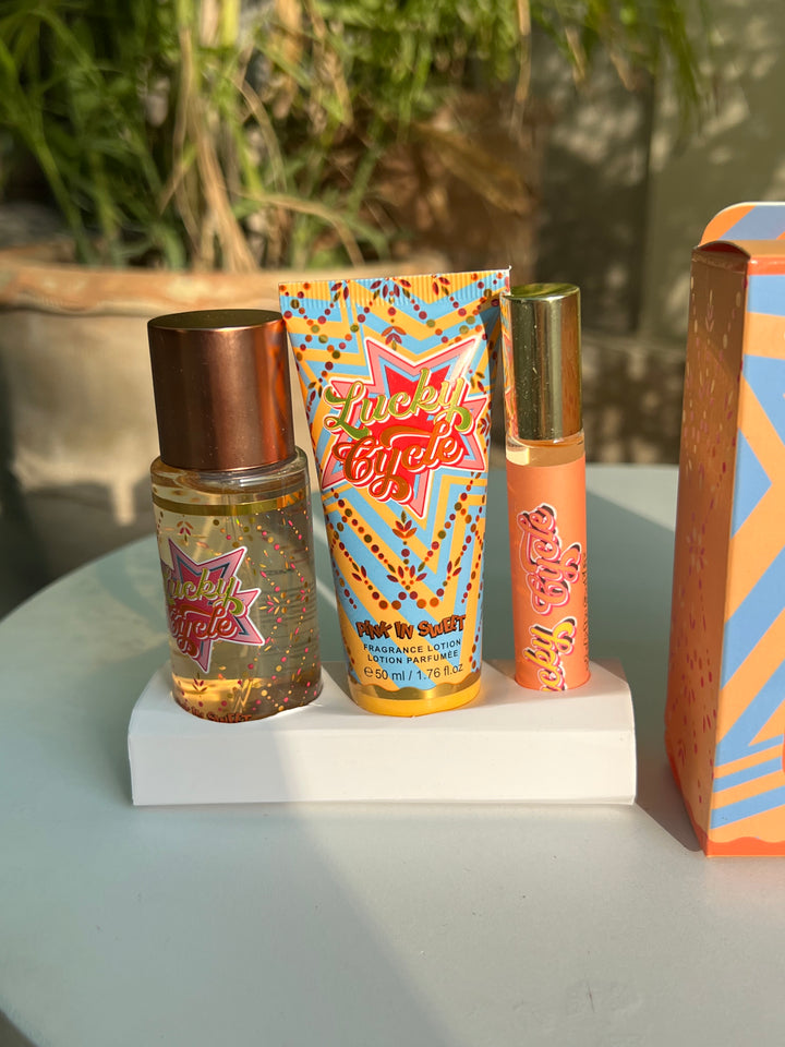 Smell sweet and stay fresh all day! 💖 This fun and vibrant trio includes a body mist, lotion, and roll-on perfume — perfect for everyday wear or gifting. A delightful mix of fruity and floral notes that keep you glowing and confident!